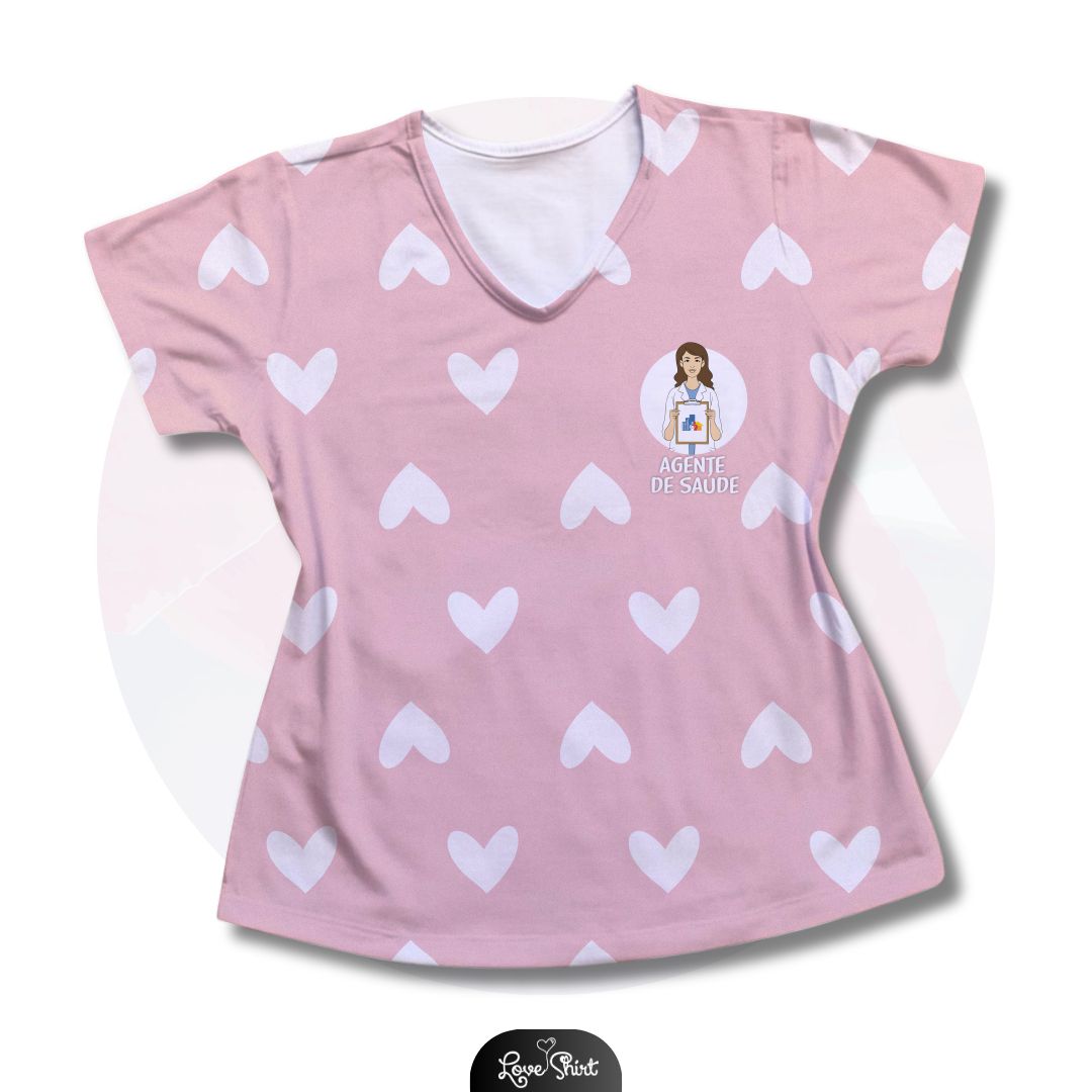 T-SHIRT PROFISSÃO AGENTE DE SAÚDE MULHER FD ROSA E CORAÇÕES